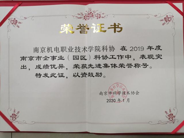2020年1月3日,南京市科协十届四次全委(扩大)会议在南京科技馆召开,会上举行了首批“南京市企事业(园区)科技工作者之家示范基地”授牌仪式。学院科协作为南京市唯一一家高校科协、全市四家科协之一获得“南京市企事业(园区)科技工作之家2019-2024年综合类示范基地”,学院副院长刁爱军代表学院接受了铜牌。同时,学院科协被评为2019年度市级企事业(园区)科协工作先进集体,学院科协秘书长李木香被评为2019年度市级企事业(园区)科协工作先进个人。