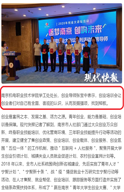 2020年9月21日下午,beat365受邀参加了在南京市人力资源和社会保障局指导下,由南京市职业技术培训指导中心主办、南京市华普赢之道职业培训学校承办的南京市2020年度创业大讲坛首场活动。南京日报、现代快报、南报网等多家媒体对beat365学生参与创业、技能培训项目的相关情况进行了采访和报道。