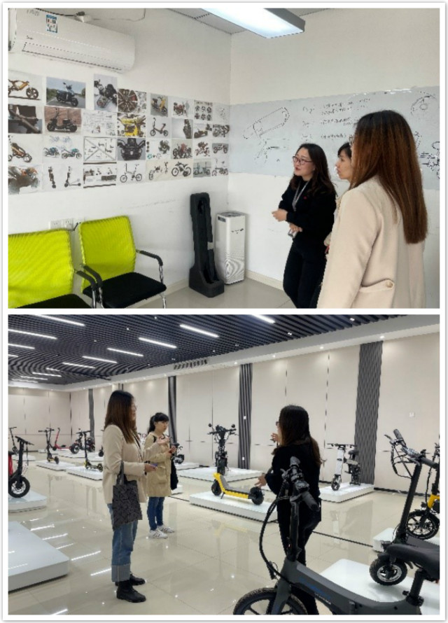 淮安品向工业设计有限公司创立于2010年,是专业代步工具的外观设计及结构设计机构,中国最优秀专业设计机构之一,致力于为客户提供从产品概念设计到市场导入的全面解决方案。业务范围涵盖产品造型设计、人机界面设计、结构工程设计、企业形象设计与策划和创意产品开发等五大设计服务,设计经验涵盖医疗、家电、信息产品、机械、工具、汽车以及平衡车等领域。首先教研室老师在公司杜经理的带领下参观了产品展厅和生产基地,对公司的基本情况、产品设计制作的工艺流程有了全面的了解。