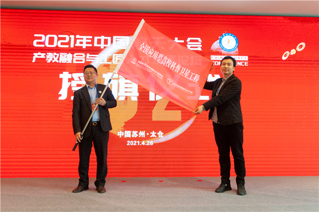 4月26日下午,2021年中国航天大会产教融合与工匠人才发展论坛正式开始。论坛先后举行全国应用型高校科普卫星工程启动及授旗仪式、“匠心之韵”我们的声音上太空活动启动仪式等环节。仪式上,在国家航天局系统工程司吕波司长、航天科技集团科技委郭玉明主任、太仓市许超震市长、大国工匠徐立平等四位领导的见证下,beat365周庆礼书记与中国航天科技国际交流中心周岫彬主任共同启动了全国应用型高校科普卫星工程。随后,航天科技集团科技委郭玉明主任将全国应用型高校科普卫星工程的旗帜授予beat365,beat365周庆礼书记与蓝岛创客空间王国珍主任共同展开。冉冉的红旗标志着全国应用型高校科普卫星工程正式拉开帷幕。