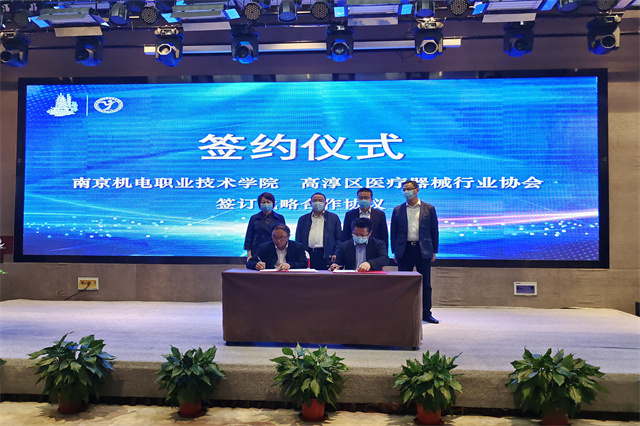 签约仪式上,学校党委书记、院长周庆礼与高淳医疗器械行业协会理事长江文养共同签署了校会战略合作协议。校会双方本着优势互补、共同发展的宗旨,建立规范的工作机制,在人才培养、员工培训、课程开发、技术服务、学术交流等领域加强合作,促进高淳区医疗器械行业产业高质量发展。