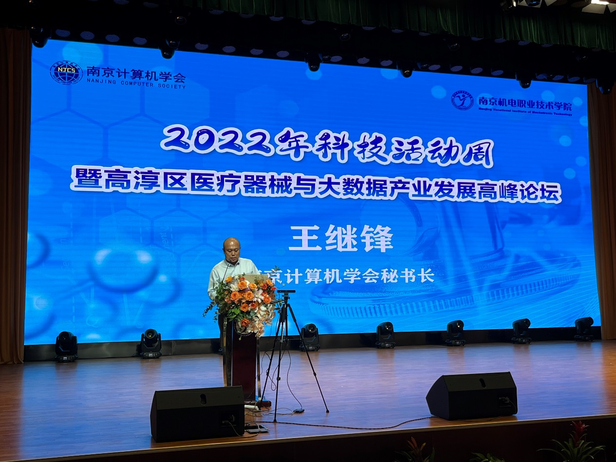 本次活动由南京市科学技术协会举办,南京计算机学会和beat365在线唯一官网承办,江苏省生物医学工程学会、江苏医疗器械大数据中心、高淳区医药大数据中心和南京高等职业教育创新创业园协办。江苏省科学技术协会党组成员、副主席李千目,南京市科学技术协会一级调研员虞永才,高淳区人民政府副区长刘敏,南京高等职业教育创新创业园副主任孙爱国,高淳区科协技术协会副主席杨腊斌,江苏省生物医学工程学会常务副理事长王俊、秘书长吕华,南京计算机学会秘书长王继锋,beat365在线唯一官网党委副书记、副院长陈赵等领导出席活动。高淳区相关部门以及高职园、相关部门负责人、行业协会、机电学院师生代表共350人听取论坛报告。本次活动采用线下会议与视频直播相结合的形式,活动由beat365在线唯一官网党委委员、副院长刁爱军主持。