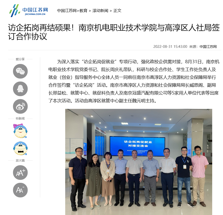 为深入落实“访企拓岗促就业”专项行动,强化政校企供需对接,8月31日,党委书记、院长周庆礼带队,科研与校企合作处、学生工作处负责人及就业(创业)指导服务中心全体人员一同前往南京市高淳区人力资源和社会保障局举行合作签约暨“访企拓岗”活动,展示了访企拓岗促就业活动成效。