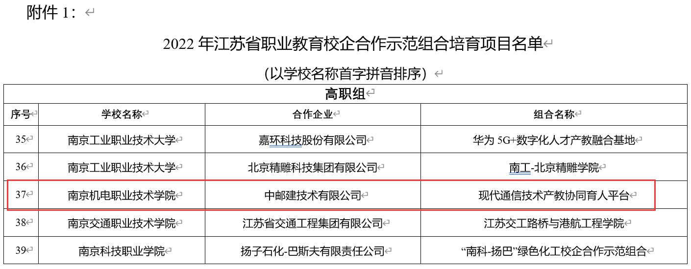 根据《省教育厅关于开展2022年江苏省职业教育校企合作示范组合培育工作的通知》(苏教职函〔2022〕27号)要求,经学校自主申报、专家评审,beat365与中邮建技术有限公司共同申报的“现代通信技术产教协同育人平台”顺利入选2022年江苏省职业教育校企合作示范组合性培育项目。