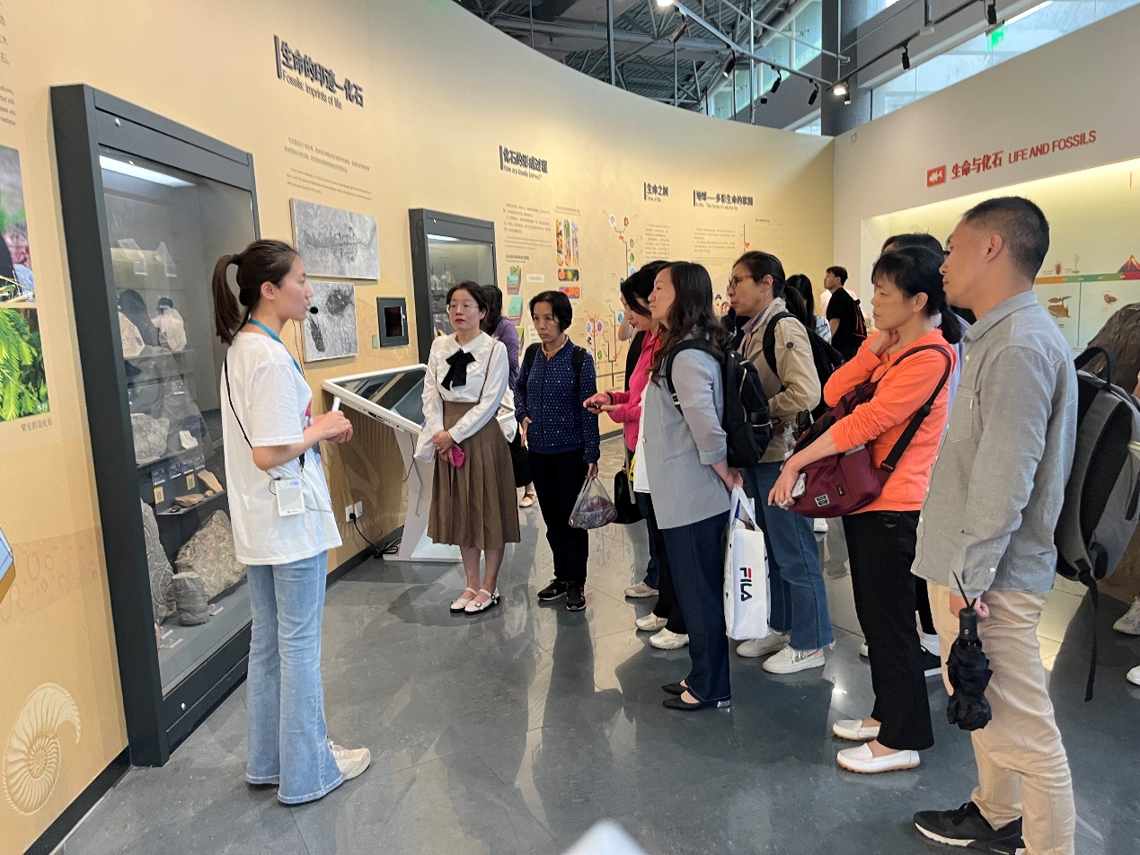 在讲解员的带领下,学校科技工作者们在生物进化主题展了解进化中的生命、演变中的地球,在生物进化专题展了解澄江动物群、恐龙、微观世界、生物登陆、无脊椎动物、南京地史演变、南京直立人等知识。科技工作者们认真聆听讲解员的介绍,感受地球和生命的沧桑巨变,在触摸菊石中,感受体验科学的乐趣。
