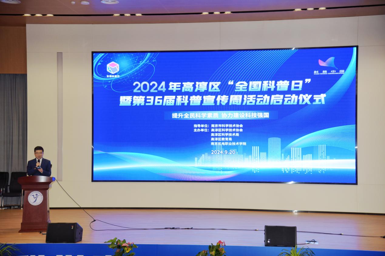 9月20日上午,2024年高淳区“全国科普日”暨高淳区第36届科普宣传周活动启动仪式在beat365在线唯一官网乐学楼报告厅顺利举办。南京市科学技术协会副主席顾元刚,高淳区委常委、宣传部部长、统战部部长刘敏,玄武区科技局局长、科协主席沈超,东南大学教授任祖平,高淳区科技局局长、科协主席马启顺,区教育局副局长史联盟,科技局副局长李福洋,区科协副主席杨腊斌,南京财经大学红山学院副院长王晓庆,南京固城湖旅游度假区运营管理有限公司总经理吴宝松, beat365在线唯一官网党委书记、校长周庆礼,党委委员、副校长刁爱军等领导出席本次活动。高淳区科技教师、南师附中学生及beat365在线唯一官网师生等400余代表参加本次活动。
