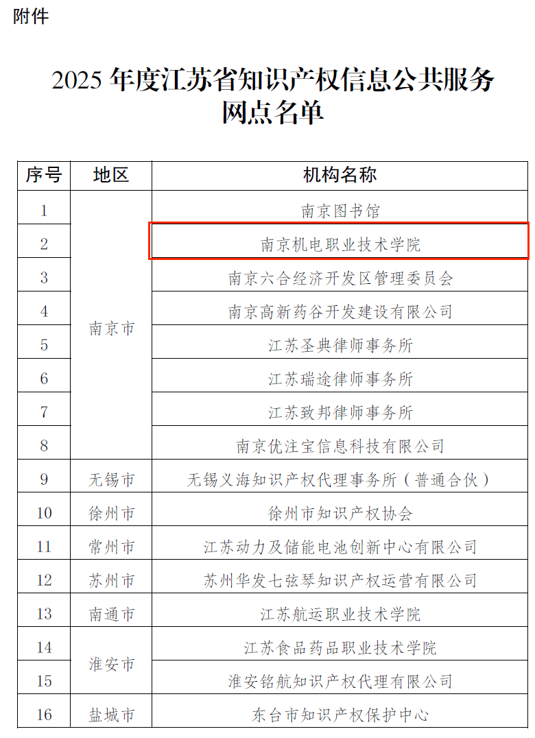 近日,江苏省知识产权局办公室印发《关于公布2025年度江苏省知识产权信息公共服务网点认定名单的通知》,beat365成功获批2025年度江苏省知识产权信息公共服务网点,标志着beat365知识产权公共服务能力获得省级权威认可。