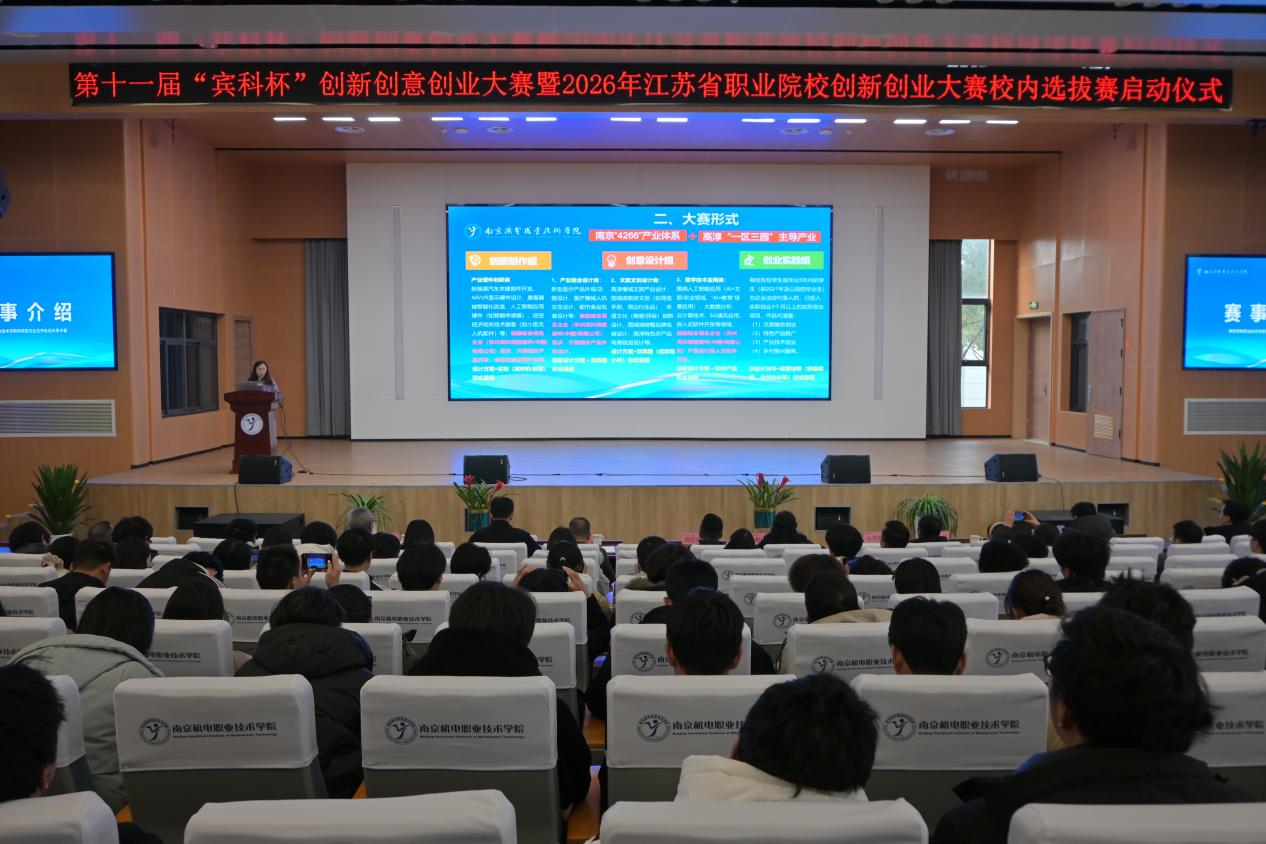 启动仪式上,汪春荣、孙爱国、吕鹏飞、程伶俐、周庆礼共同按下启动按钮,第十一届“宾科杯”创新创意创业大赛暨2026年江苏省职业院校创新创业大赛校内选拔赛正式启动。
