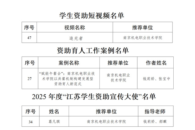 由钱莉娇、朱丹丹指导,葛凡琪同学及资助宣传大使团队拍摄的资助短视频《追光者》入选学生资助短视频优秀作品。由张宝中、钱莉娇撰写的案例《“赋能午餐会”:beat365在线唯一官网以共餐机制构建发展型资助育人新范式》入选资助育人工作典型案例。信息工程系2023级学生葛凡琪获评2025年度“江苏学生资助宣传大使”,beat365学子连续3年获此殊荣。