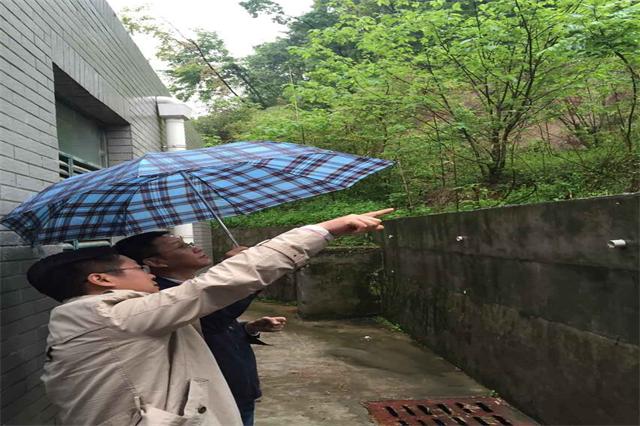 随后,卢北宁总经理一行在周庆礼院长的陪同下,对学院山体护坡、C栋教学楼等安全重点部位冒雨进行了现场检查。