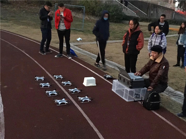 最后,赵博士团队在操场上进行了无人机协同编队飞行表演,八架无人机同时起飞,在空中编队构成各种数字和图案,并根据灯光变换颜色,配上激动人心的音乐,整场表演非常精彩。赵博士补充道,编队队形的设计,既要让各个无人机按照预定的队形排列,又要确保相互不碰撞,需要架构专用软件,从设计到最后的调试,耗时近3年。赵博士关于队形设计、气动耦合、队形的动态调整、航迹规划、信息互换以及编队飞行控制策略等技术的研发已位于国际领先地位,并将于近期参加“国际分布式智能开放挑战赛”这一飞行界“奥运会”。飞行表演让师生们大饱眼福,大呼过瘾,大家不仅享受到了无人机表演带来的高科技视觉盛宴,也激发了师生们学习无人机的兴趣。