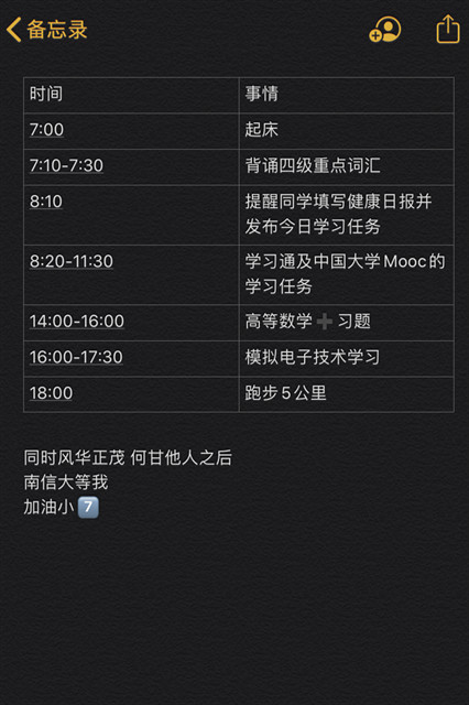 戚珉恺的短期目标是通过专转本考试进入南京信息工程大学继续深造。有了前进的目标,就有了强大的动力,他每天在备忘录里规划好当天的学习计划,数学基础薄弱的他从头开始学起,每天用定量的习题来巩固。