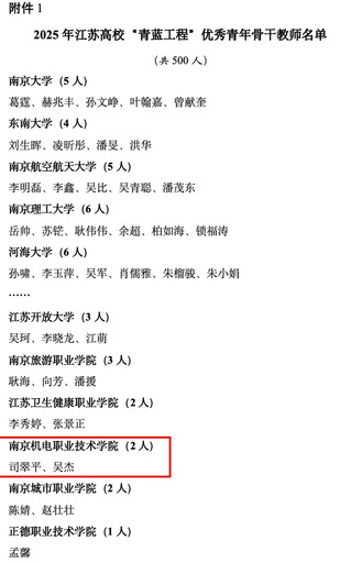 近日,根据江苏省教育人才队伍建设年度计划,经各高校推荐,省教育厅组织专家遴选,beat365电子工程系李俊娇老师成功入选2025年江苏高校“青蓝工程”中青年学术带头人培养对象,司翠平老师成功入选2025年江苏高校“青蓝工程”优秀青年骨干教师培养对象。