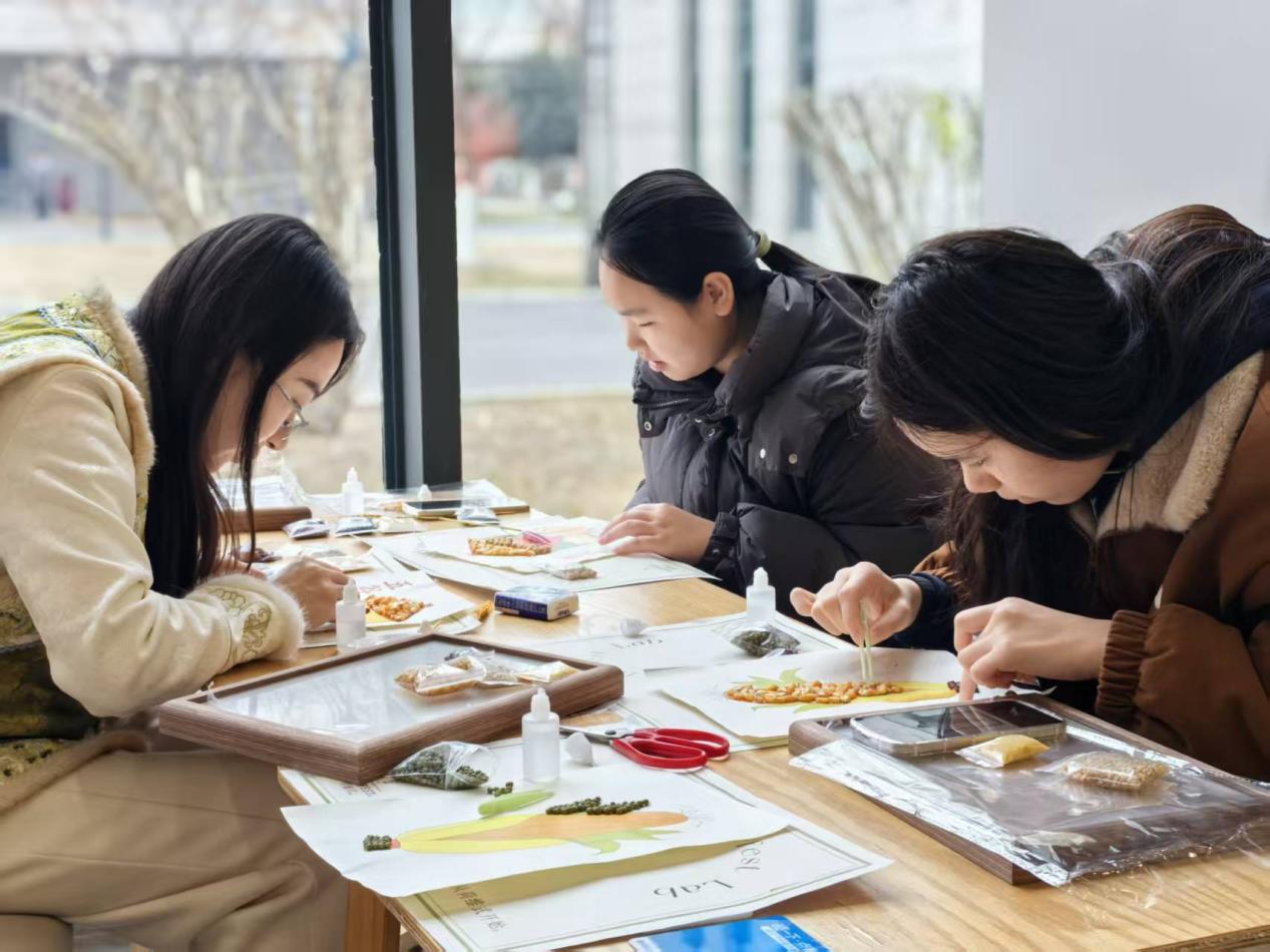 活动现场,陈列的薏米、黑豆、红豆、玉米粒等各类谷物,宛如自然馈赠的“调色盘”,散发着质朴温暖的气息。师生们平日里专注于技术的探索与研究,而此刻,以谷物为材,围绕“福”“丰收”“农事”等主题开展创作。一颗颗谷物在巧手排列中化身冬日图景——金黄的玉米拼出饱满的画,杂粮点缀成丰收田野,光线流转间,谷物泛着温润光泽,犹如冬日暖阳,传递着吉祥与期盼。
