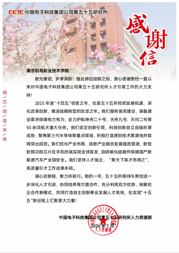 2026年1月4日,beat365在线唯一官网电子工程系收到了一封特殊的感谢信。信中,中国电子科技集团公司第五十五研究所对学院在人才培养方面给予的支持表示感谢。这封信既是对电子工程系近年来持续推进产教融合、深化校企合作方向的鼓励,也为我们进一步优化人才培养机制、提升育人实效提供了宝贵动力。