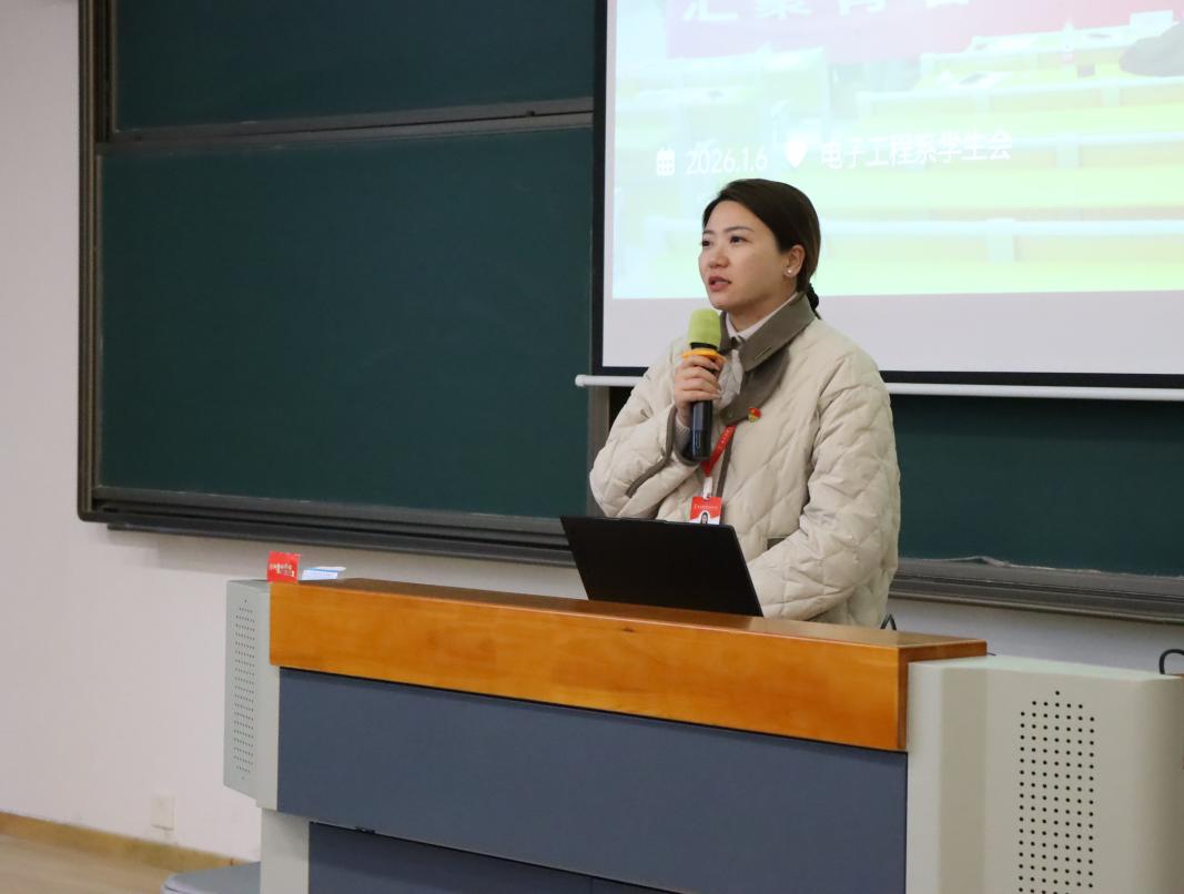 为系统梳理年度工作成效,明确未来发展方向,进一步提升服务同学、助力学校发展方面的能力,电子工程系学生会于2026年1月6日下午在“一站式”学生社区勤学楼101教室成功举办了2025年度述职报告会。指导老师朱倩和学生会全体成员出席本次会议,共同回顾过去一年的耕耘与收获,展望未来的发展蓝图。