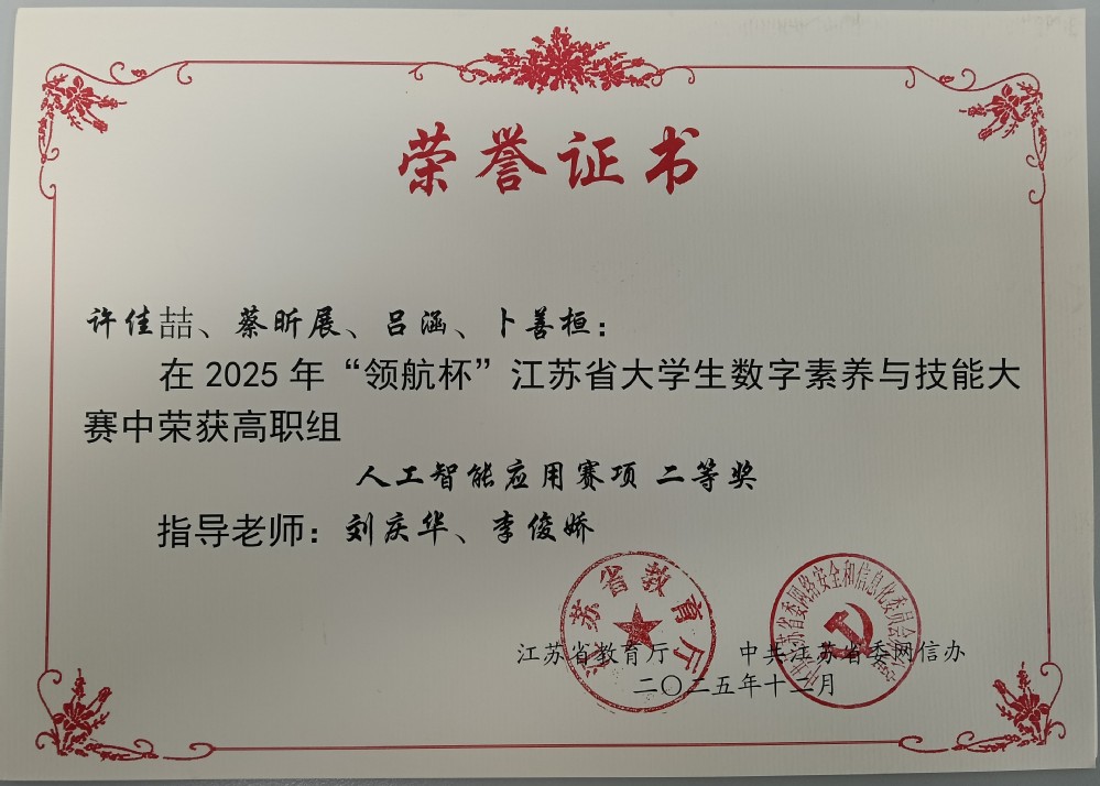 近日,由江苏省教育厅、中共江苏省委网信办联合主办的2025年“领航杯”江苏省大学生数字素养与技能大赛获奖结果正式公布,beat365电子工程系许佳喆、蔡昕展、吕涵、卜善桓四位同学组成的团队,在刘庆华、李俊娇两位老师的悉心指导下,凭借“智能AI分拣系统”项目,历经线上赛项资料提交与视频展示的初赛选拔,最终在高职组人工智能应用赛项中脱颖而出,荣获二等奖,为学校赢得了荣誉!