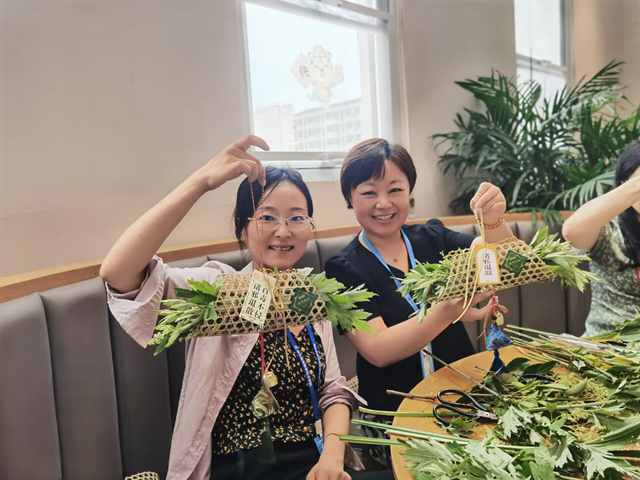 随后,参加活动的老师们根据指导老师的讲解,折竹片、系五彩绳、挂铃铛、系香囊,装叶材(艾草、菖蒲、玉簪叶等),最后调整好门挂的平衡点,就这样一个艾草香囊门挂就完成了。在制作的过程中,老师们欢声笑语、其乐融融,共同沉浸在轻松、愉快的活动氛围中。