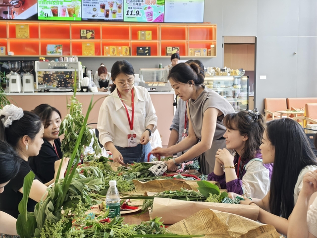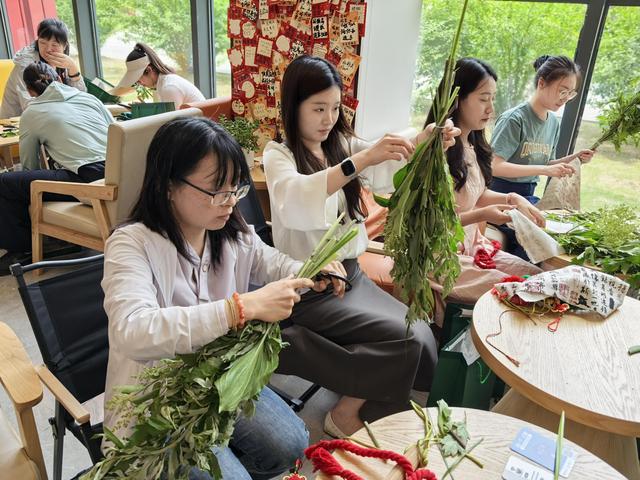 活动特邀专业手工老师现场指导,从艾草的挑选与修剪,到彩绳的编织技巧,再到竹筒与香囊的搭配艺术,老师耐心讲解、亲身示范。教职工们全神贯注,紧跟指导步骤,同时大胆发挥创意:有人将艾草与彩绳编织成精致的花束,有人在竹筒上系上象征平安的葫芦,还有人用香囊缝制出独一无二的端午挂饰。现场气氛热烈,欢声笑语不断,大家在动手实践中感受着传统手工艺的魅力,也在相互交流中增进了情谊。