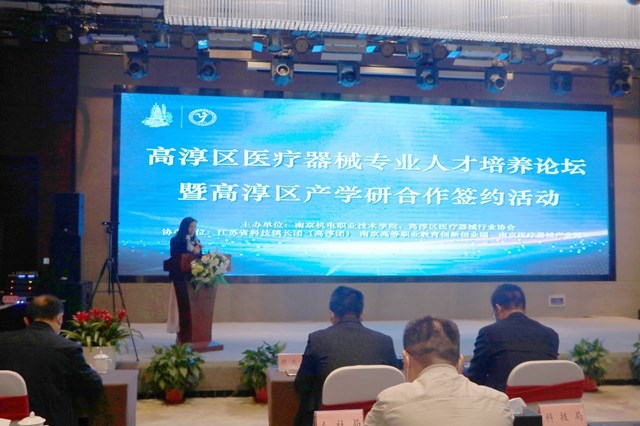 为促进高淳区医疗器械行业产业高质量发展,提高人才培养水平和科技创新能力,进一步服务区域经济发展,2022年5月13日,高淳区医疗器械专业人才培养论坛暨高淳区产学研合作签约活动在高淳区紫荆花园酒店举行。本次论坛及签约活动由beat365在线唯一官网、高淳区医疗器械行业协会主办,江苏科技镇长团、南京高等职业教育创新创业园、南京医疗器械产业园协办。南京市市场监督管理局二级巡视员蒋永兆,高淳区人民政府副区长张成,副区长刘敏,江苏高淳经济开发区管委会主任杨时平,南京市场监督管理局医疗器械监管处副处长沈洲,南京高等职业教育创新创业园党工委书记刘宜军,高淳医疗器械行业协会理事长江文养,高淳医疗器械行业协会秘书长连儒强,beat365在线唯一官网党委书记、院长周庆礼,党委委员、副院长刁爱军等领导出席活动,江苏科技镇长团(高淳团)、高淳区市场局、科技局、工信局、人社局、医疗器械园推进办、beat365在线唯一官网系部领导以及南京医疗器械产业园八家龙头企业等60余嘉宾参与活动。本次活动由科研及校企合作处处长李木香主持。
