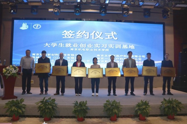 学校副院长刁爱军与南京医疗器械产业园八家龙头企业共同签订大学生就业创业实习实训基地协议,并向企业授予铜牌。校企双方将进一步深化产学研合作,为学生提供实践、创新、成长的机会,为企业引进应用型人才创造条件。学校机械工程系主任范世祥为企业专家颁发《机械设计与制造专业群医疗器械领域校外专家聘书》。