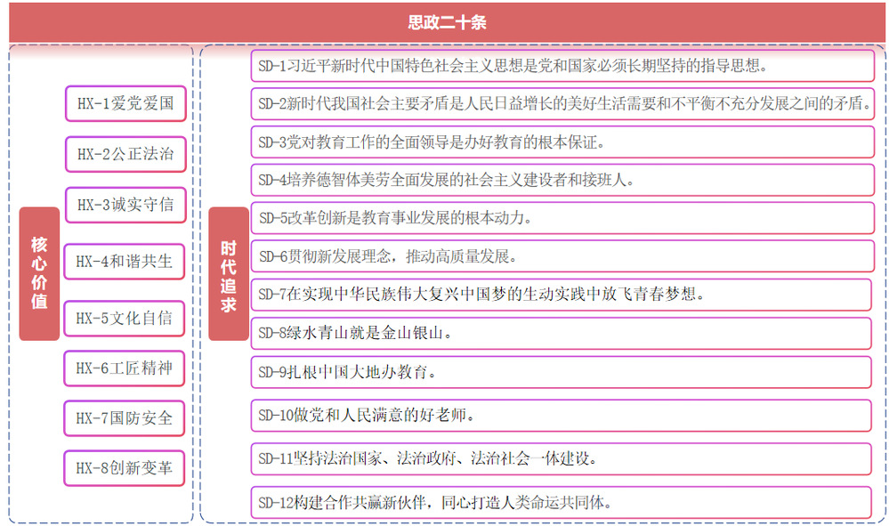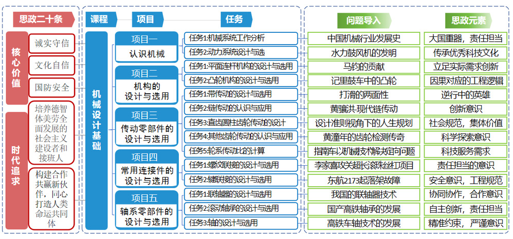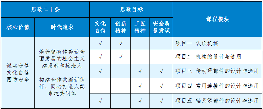 依据学院课程思政“二十条”、航天特色示范校的战略目标、机械设计与制造专业建设特点、机械设计基础的教学目标,锚定“以机械知识为基,传工匠爱国精神”的核心方向,明确将文化自信、创新精神、工匠精神、安全质量意识作为思政育人的重点,确立课程思政的教学目标及教学任务。