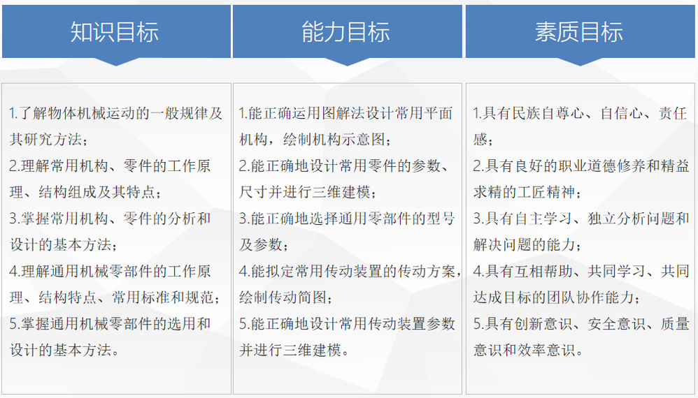 《机械设计基础》作为机械设计与制造专业群的核心专业基础课程,始终以机械设计核心知识传授为基石,以综合能力培养为导向。课程致力于引导学生掌握机械设计的一般规律,熟悉常用机构的工作原理、运动特性及设计方法,掌握通用机械零件的设计理论与计算方法,具备初步设计常用机械结构的能力与技术改进创新意识,会运用机械设计标准、规范、手册及技术资料解决实际问题,培养严谨务实的工程思维与科学精神,在设计实践中严格遵守行业标准与设计规范,树立质量第一、安全至上的责任担当意识。