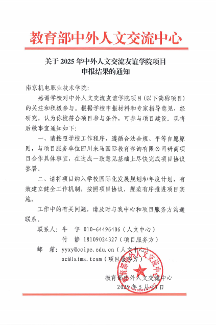 为提高学校国际交流与合作建设水平,积极扩大对外开放,深入实施“职教出海”,学校积极开展中外人文交流友谊学院项目申报工作。近日,经教育部中外人文交流中心批准,我校获批立项中外人文交流友谊学院项目。