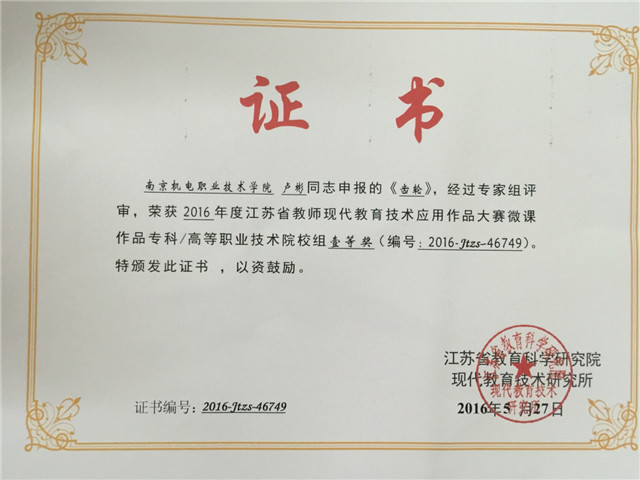 在2016年江苏省第十四届教师现代教育技术应用作品大赛中,机械工程系卢彬老师,申报的微课作品《齿轮》,经专家组评审,荣获2016年度江苏省教师现代教育技术应用作品大赛微课作品高等职业技术学院组一等奖。