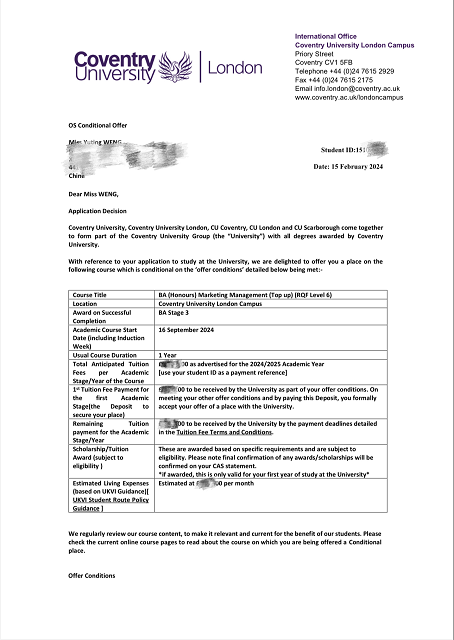 近日,机械工程系机械制造及自动化212班同学翁雨婷,通过自身努力和系统学习,被英国考文垂大学本科录取,即将开启英伦留学之旅。