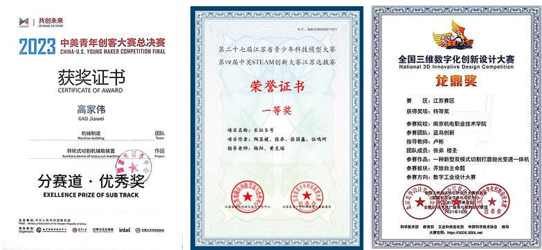 “以赛促学”成为学生快速成长与提升的关键路径,学生在知识储备、专业技能、团队协作和创新思维等多方面实现质的飞跃。近年来,机械制造及自动化专业学生积极参加各类竞赛,共获得国家级奖项12项,省级奖项60项,校级奖项3项,共计75项。其中获得江苏省大学生职业规划大赛特等奖1项;全国三维数字化创新设计大赛江苏省选拔赛特等奖1项;江苏省职业院校技能竞赛获得二等奖2项,三等奖2项等。