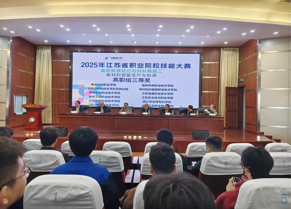 2025年4月20日,江苏省职业院校技能大赛“新材料智能生产与检测”赛项在南通职业大学圆满落幕。本次大赛吸引了来自38所院校的114名选手参赛。经过紧张激烈的角逐,由机械制造及自动化专业桑晶、徐磊老师指导的李新梁、刘欢、彭博同学组成的团队荣获学生组三等奖。