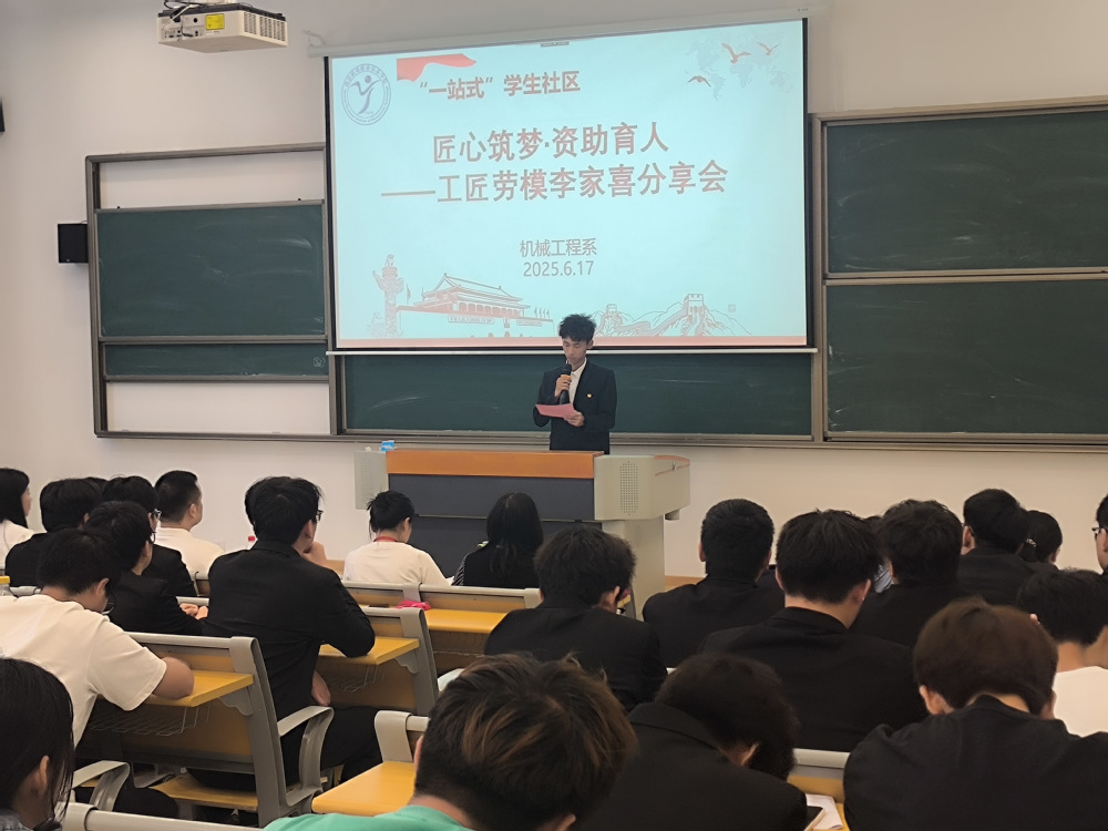 2025年6月17日,机械工程系于“一站式”学生社区勤学楼105教室举办“匠心筑梦,资助育人——工匠劳模李家喜分享会”,邀请南京工艺装备制造有限公司首席技师李家喜进行讲授,机械工程系党支部书记胡枫、辅导员、专业老师以及获助学生参会。