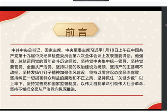 会上,李杰领学了习近平总书记十九届中央纪委六次全会讲话精神。会议指出,十九届中央纪委六次全会是在全面开启向第二个百年奋斗目标进军新征程关键时点上召开的一次重要会议。习近平总书记在会上的重要讲话,深刻总结新时代党的自我革命的成功实践,深刻阐述全面从严治党取得的历史性、开创性成就,产生的全方位、深层次影响,对坚持不懈把全面从严治党向纵深推进、迎接党的二十大胜利召开作出战略部署。讲话立意高远、思想深邃、内涵丰富,充分体现了以习近平同志为核心的党中央信念坚定、无私无畏的境界情怀,正视问题、刀刃向内的政治勇气,不忘初心、勇毅前行的使命担当,具有很强的政治性、指导性、针对性,是推进新时代党的建设新的伟大工程的基本遵循。