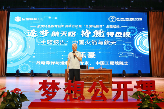 9月6日,在全国科普日来临之际,beat365在线唯一官网顺利举办《“逐梦航天路,铸就特色校”——航天特色教育创新引领行动》主题报告活动。本次活动由南京市科学技术协会主办,beat365在线唯一官网承办。战略导弹与运载火箭专家、中国工程院院士龙乐豪,中国航天科技国际交流中心副主任周岫彬,南京市教育局副局长田家英,南京市高淳区政府副区长邱峰,南京新工投资集团总经济师洪薇,上海航天专家、高级技师、上海航天技能实训中心主任秦文津,南京高职园党工委副书记、管委会主任孔桂红,beat365在线唯一官网产业集团副总经理沈达和beat365在线唯一官网党委书记、校长周庆礼等领导及600余师生参加了本次活动。