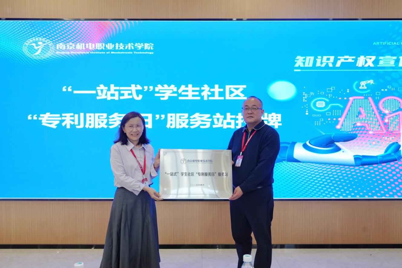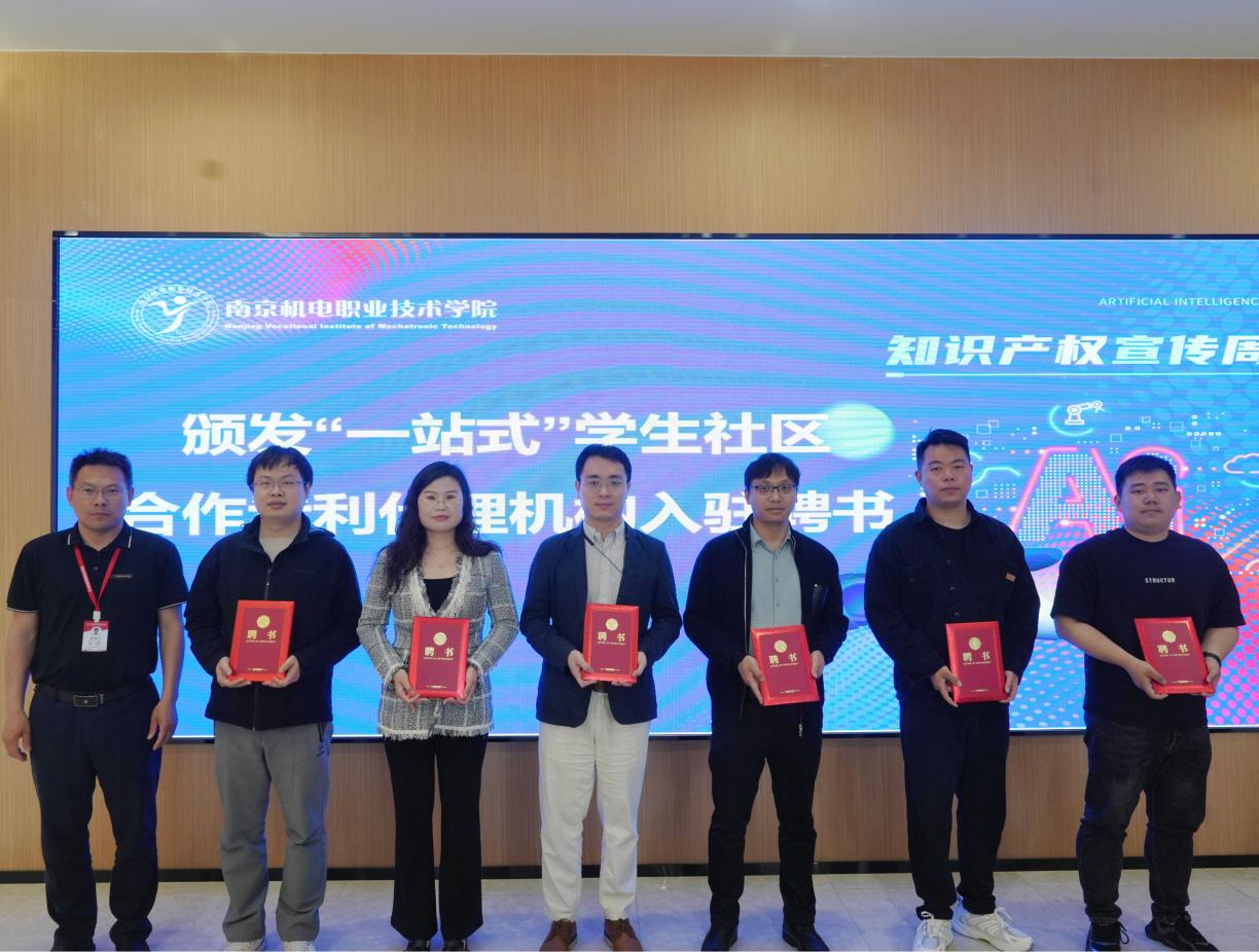 “专利服务日”入驻仪式上,赵学洪向李木香授予“一站式”学生社区“专利服务日”服务站牌匾,标志着学校专利服务实体化迈出关键一步;张宝中向南京利丰知识产权代理事务所等6家合作专利代理服务机构代表颁发入驻聘书,合作机构将以‘每周驻校服务+24小时云端响应’模式,为师生提供从创意挖掘到专利布局的全链条护航。