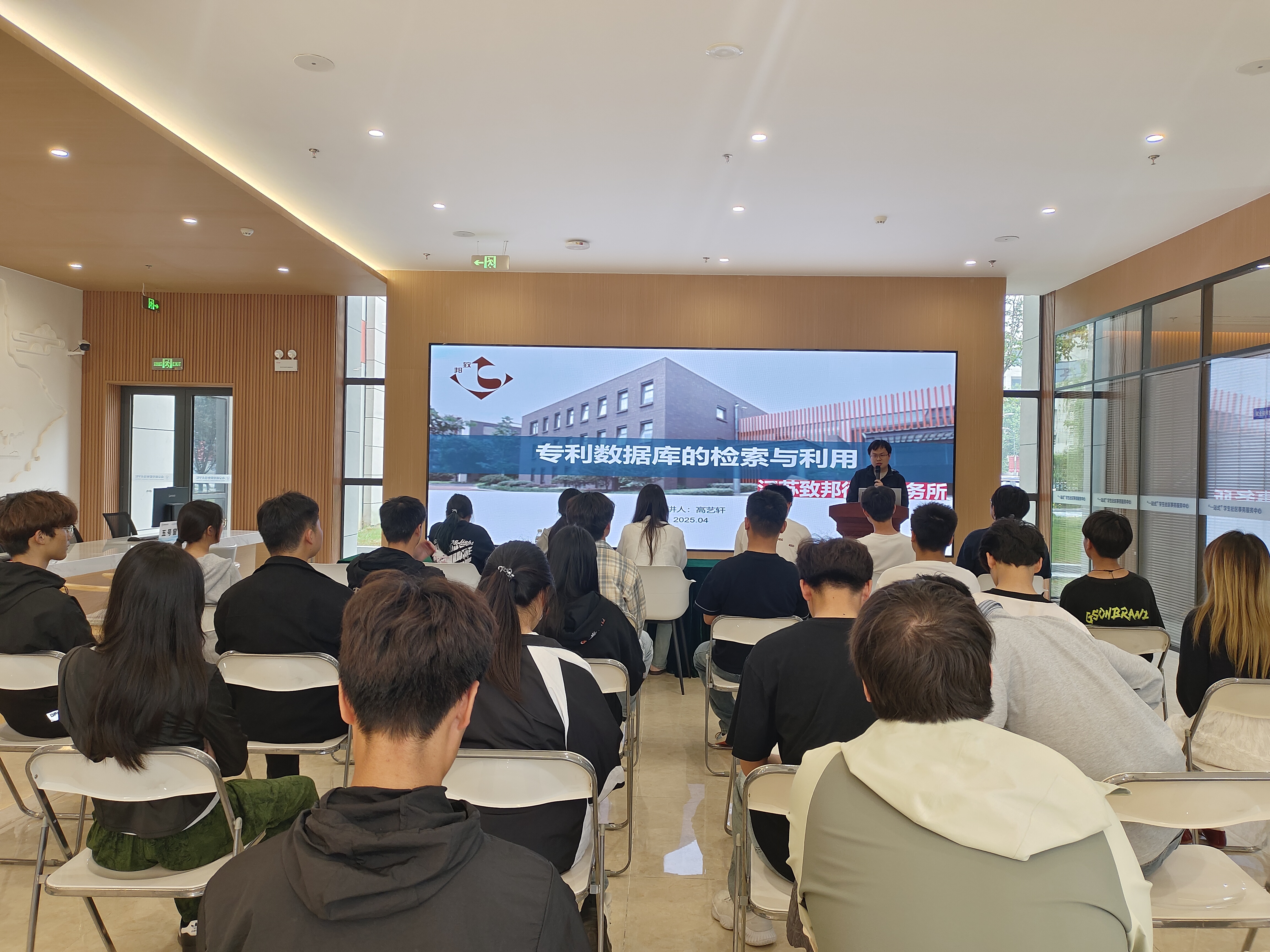 主题讲座中,江苏致邦律师事务所专利代理人高艺轩为学生带来《专利数据库的检索与利用》主题报告。通过实时演示与提问互动相结合的方式,以“立牌外观设计”为实操案例,现场演示了如何通过关键词组合、分类号筛选及图像检索功能精准定位目标专利。学生们在沉浸式操作中掌握了外观设计专利的检索技巧,直观领悟到高效检索对原创成果保护的核心价值。