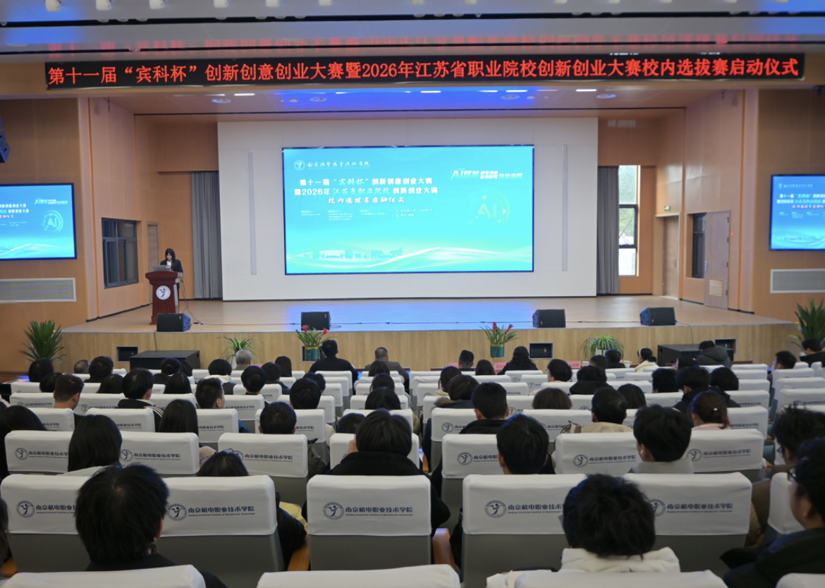 2025年12月30日下午,学校第十一届“宾科杯”创新创意创业大赛暨2026年江苏省职业院校创新创业大赛校内选拔赛启动仪式在乐学楼101举行。南京高等职业教育创新创业园管委会副主任汪春荣,南京市高淳区科学技术协会副主席孙爱国,南京高淳高新技术产业开发区管理办公室副主任吕鹏飞,扬州工业职业技术学院创新创业学院院长颜正英,宾科精密部件(中国)有限公司厂长程伶俐,学校党委书记、校长周庆礼,党委委员、副校长刁爱军,科研及校企合作处处长李木香、各部门负责人等领导出席启动仪式。合作单位代表及师生代表共500余人参加活动。