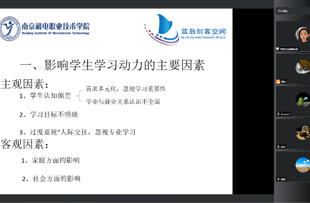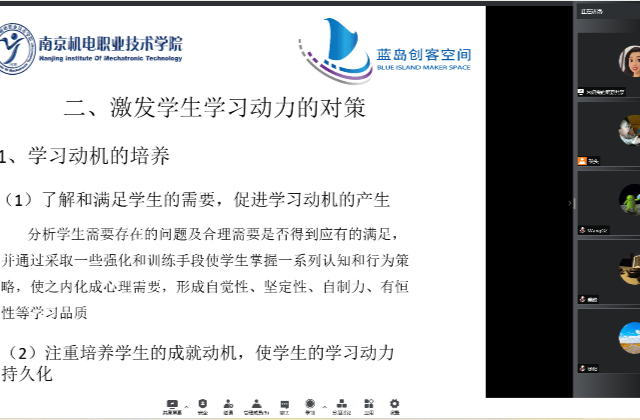 学生的学习动力取决于兴趣,兴趣又往往来源于教师的讲授和有目的培养。9月27日,蓝岛创客空间创新教研室以“如何激发学生的学习动力”为主题开展了线上教研活动。本次教研活动由蓝岛创客空间朱妍焘老师主持,蓝岛创客空间王国珍主任及教研室全体老师参加了本次教研活动。