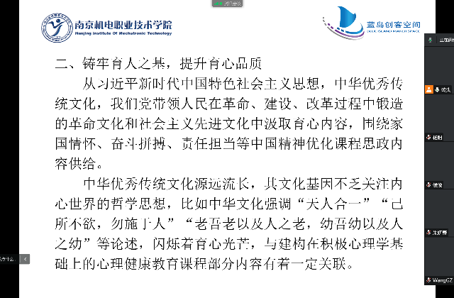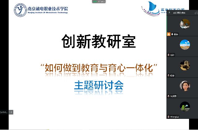 今年教育部印发的《高等学校课程思政建设指导纲要》,将心理健康教育与中国特色社会主义教育、中国梦教育、社会主义核心价值观教育、法治教育、劳动教育、中华优秀传统文化教育一起,列为实现课程思政建设的重要组成部分。为此,蓝岛创客空间创新教研室于11月29日举行“如何做到教育与育心一体化”主题线上研讨会。本次研讨会由蓝岛创客空间黄克瑶老师主持,蓝岛创客空间主任王国珍及创新教研室全体教师参与。