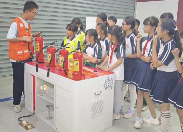 在安全应急教育体验中心,保卫处尹小雨老师带领孩子们体验了消防场景模拟灭火、VR地震体验舱、VR模拟逃生等项目。一名高淳区砖墙中心小学的学生分享了体验感受:在体验模拟灭火中,我们在身临其境中学会了灭火器的使用方法,我们仿佛就在火灾现场进行灭火作业,让我们增长了应急救援的知识和技能。