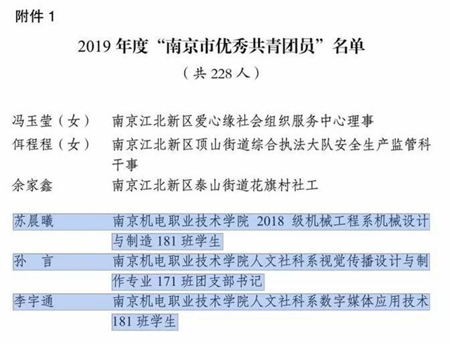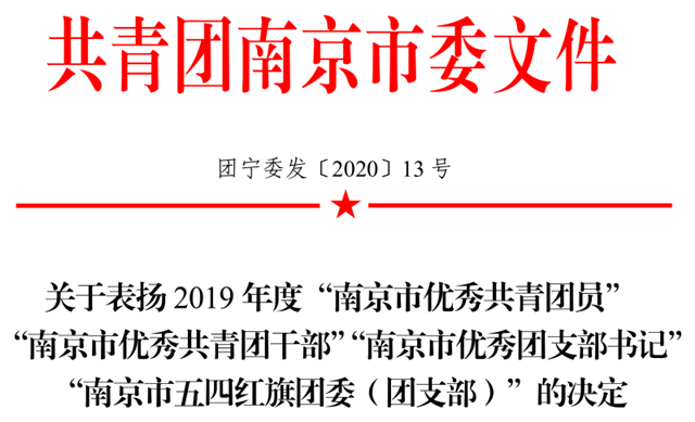 日前,共青团南京市委下发《关于表扬2019年度“南京市优秀共青团员”“南京市优秀共青团干部”“南京市优秀团支部书记”“南京市五四红旗团委(团支部)”的决定》(团宁委发﹝2020﹞13号),人文社科系视觉传播设计与制作171班团支部书记孙言同学、数字媒体应用技术181班班长李宇通同学被评为2019年度“南京市优秀共青团员”。