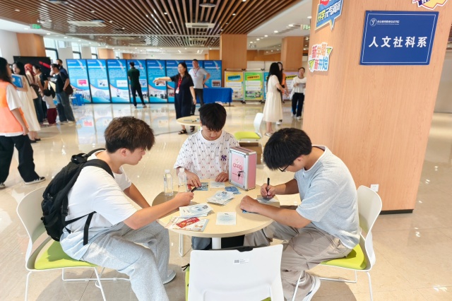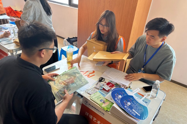 为厚植新生的民族文化自信,系部精心打造的“非遗主题迎新角”成为迎新现场一大亮点。这里陈列着往届学生的优秀设计作品,生动展现了非遗文化的独特魅力与学科专业特色。2025级新生们驻足观赏、沉浸式体验,在一件件充满匠心的作品中感受中华优秀传统文化的深厚底蕴,文化认同的根基在潜移默化中得以筑牢。不少学生志愿者也主动留在迎新角,为新生讲解作品背后的非遗故事与创作历程,让文化传承更具温度。