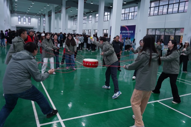 在第一个项目“绳舞同心”中,摇绳队员精准把控节奏,跳绳队员们排队站好准备起跳,绳起绳落间展现出高度默契,围观师生的加油声此起彼伏;“鼓韵齐鸣”赛场,参赛老师们紧握鼓绳,紧盯鼓面网球,通过眼神交流实时调整力度,让网球在鼓面持续弹跳,将“众人拾柴火焰高”的协作精神诠释得淋漓尽致。
