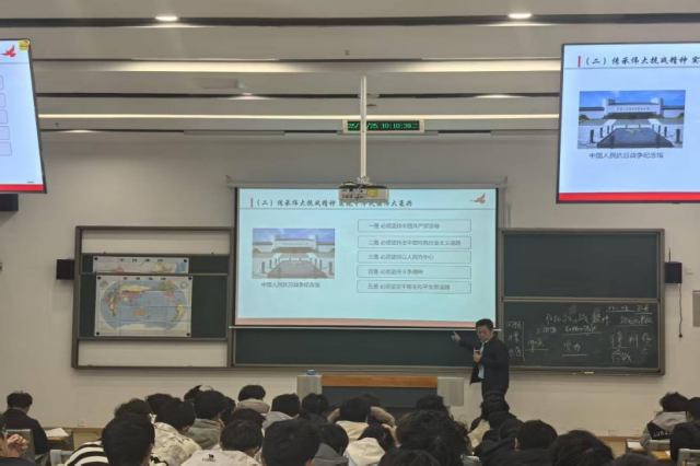 在教学过程中,周书记以严谨的史学视野,系统阐释了中国人民抗日战争的历史地位和世界意义,并从三个维度系统阐释:首先,从世界反法西斯战争全局出发,论证了中国战场作为东方主战场的重要地位;其次,通过详实的历史资料和数据,展现中国人民为世界反法西斯战争胜利作出的巨大贡献;最后,深刻分析了中国战场对日本军国主义的有力牵制及其对全球战局产生的深远影响。他强调,抗战精神是以爱国主义为核心的民族精神的集中体现,包含天下兴亡、匹夫有责的爱国情怀,视死如归、宁死不屈的民族气节,不畏强暴、血战到底的英雄气概,百折不挠、坚忍不拔的必胜信念。这种精神财富至今仍具有重要的时代价值。