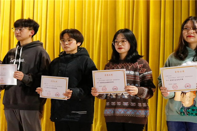 年会上,社团联合会对近期获得南京市“优秀学生社团”、“优秀学生社团干部”和“优秀学生社团指导老师”的老师与同学进行了表彰。beat365“机器人社团”、“拾光微电影协会”、“国防教育协会”别评为南京市“优秀学生社团”;吴沁洋、赵毅、谢宇航等三名同学被评为南京市“优秀学生社团干部”;朱红娟、吴杰、李萍、金慧敏等四名老师被评为南京市“优秀学生社团指导老师”。团委书记唐钰峤为各社团获奖者颁发证书。