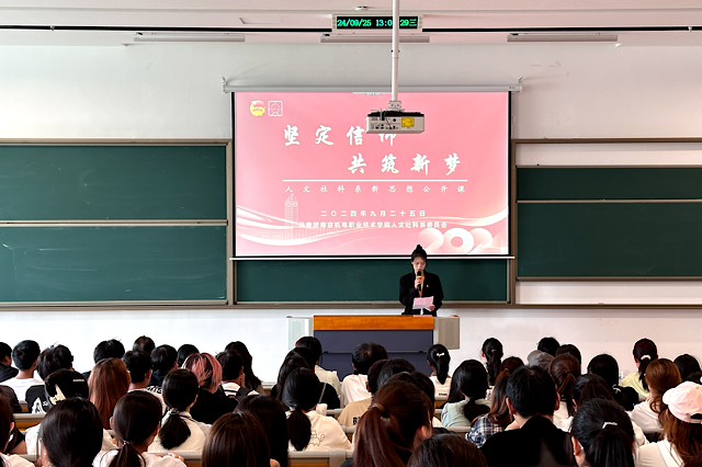 为传达党的二十届三中全会精神,确保学生紧跟时代步伐,2024年9月25日中午14:00,人文社科系团委在善学楼102开展“坚定信仰,共筑新梦”新思想公开课活动。活动由人文社科系团委兼职副书记徐金莹同志主持,思政中心毛莉老师授课,人文社科系在校团员参加学习。