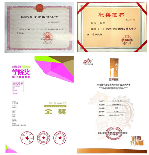 在校期间,曾获得国家奖学金、国家励志奖学金、中国大学生广告艺术节学院奖金奖、全国大学生广告艺术大赛江苏赛区一等奖、校三好学生、优秀共青团员等荣誉。