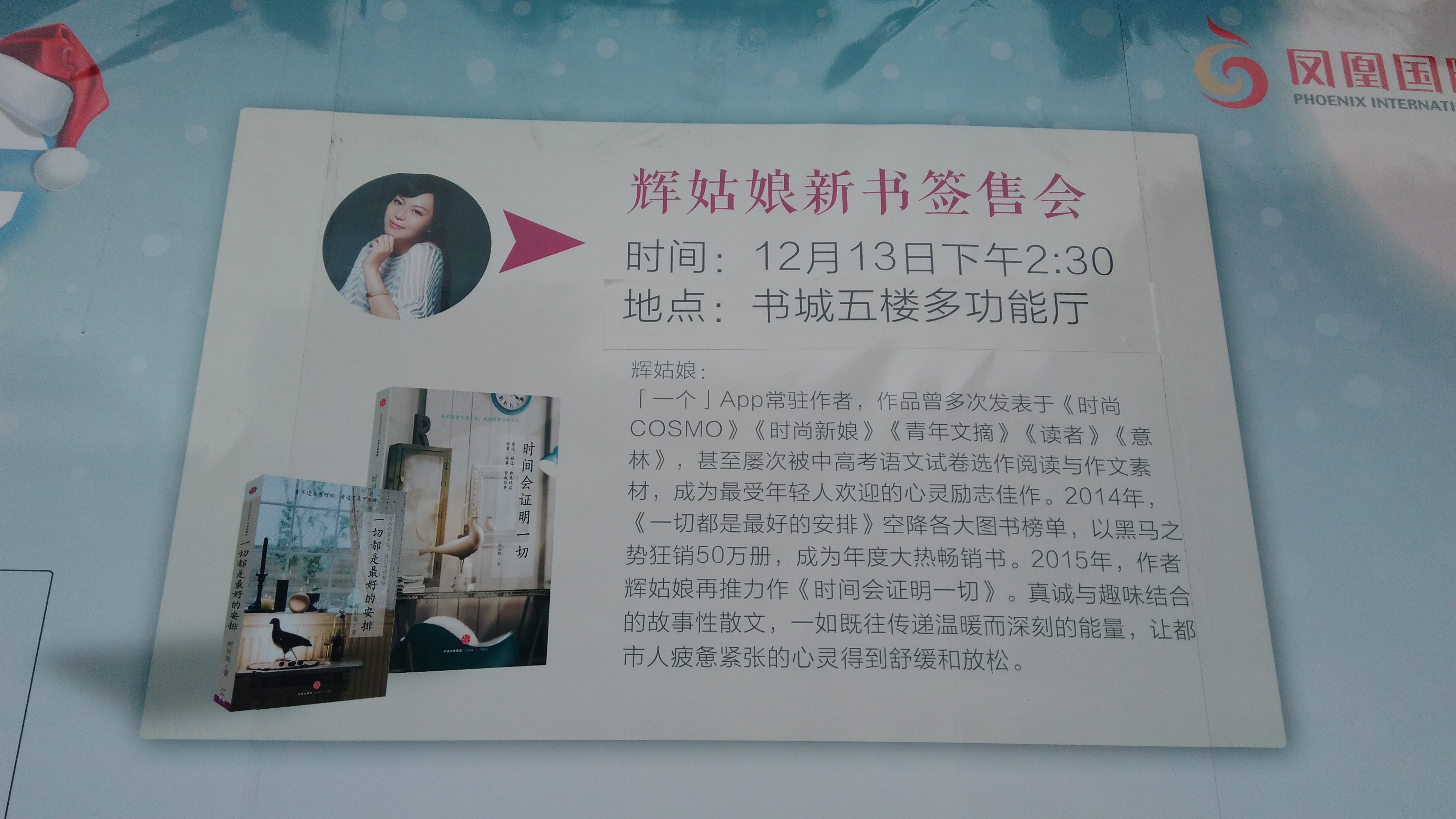 辉姑娘,原名吕辉,80后女作家,曾著有《一切都是最好的安排》。12月13日,她携新书《时间会证明一切》来到凤凰书城,举行“时间会证明一切-辉姑娘新书见面会”。本次见面会由凤凰书城、学院图书馆与信息工程系共同承办,来自信息系学生会、学院读者协会、青藤文苑、主持人协会的四十多位同学到现场观摩。见面会由南京电视台青春主播于晚梦、beat36515数控董恒同学共同主持。