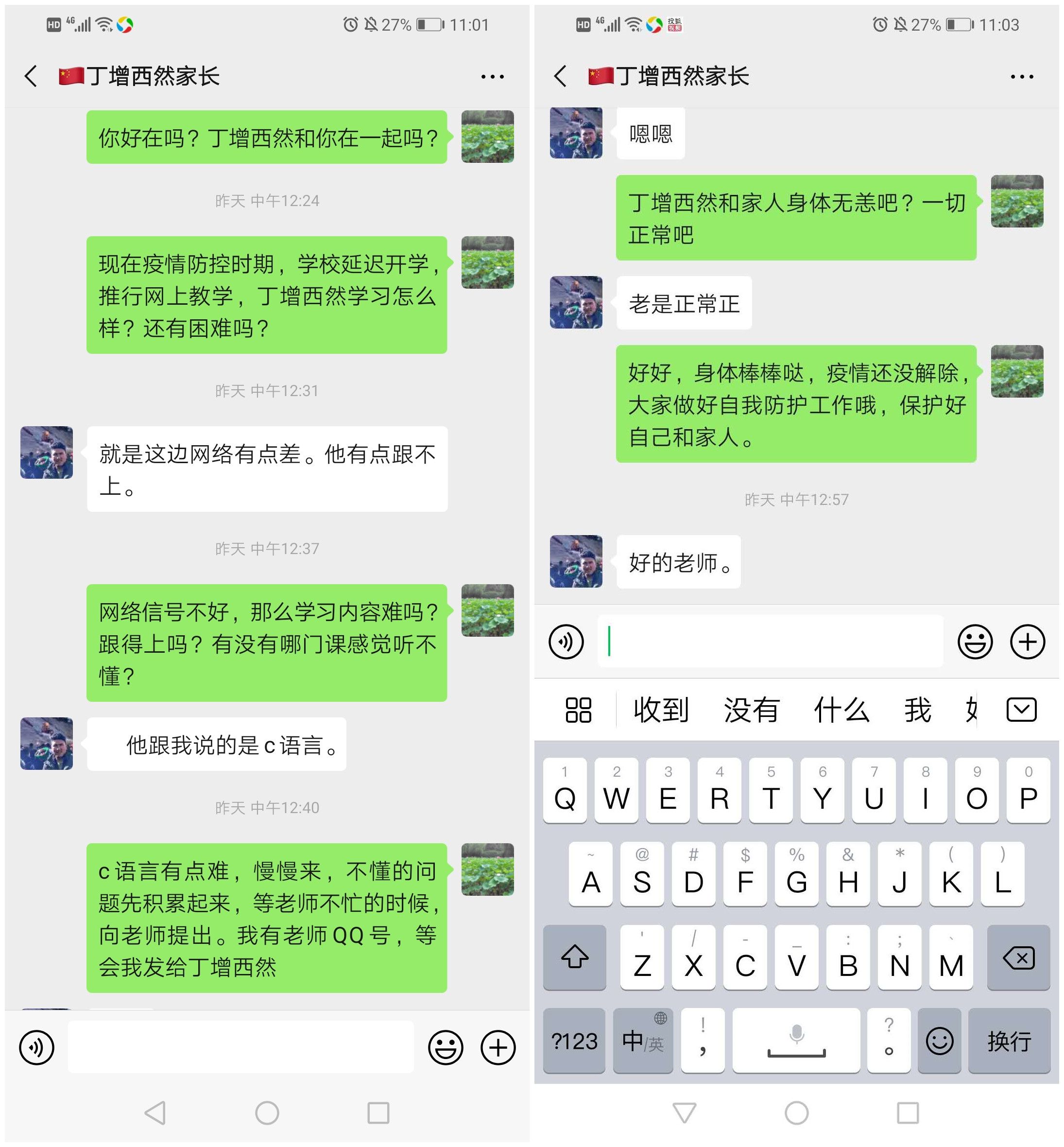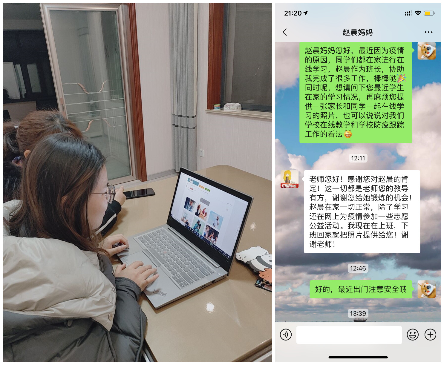 施淼同学是云计算191班的心理委员,在学校统计省厅疫情上报表的时候,施淼及时地将自己和确诊患者同一时间到访过大润发的消息反馈给了辅导员张婉佳老师,从2月10日开始,该生就开始居家隔离,在这段时间,张老师每天都保持着跟学生的联系,关注学生的日报情况,并积极与家长沟通,从上周起,学校开展了线上课,家长表示,之前孩子每天在家睡懒觉,最近一段时间,变化很大,每天坚持早睡早起,非常积极地上课,还学会了记笔记,家长对此表示非常欣慰。